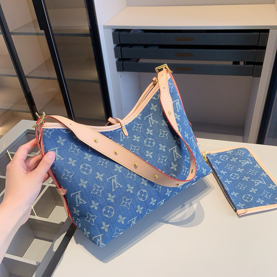 【ルイ・ヴィトン】☆キャリーオール トートバッグ|デニム素材の4点セット♪ベルトとチェーン付きで超おしゃれ!